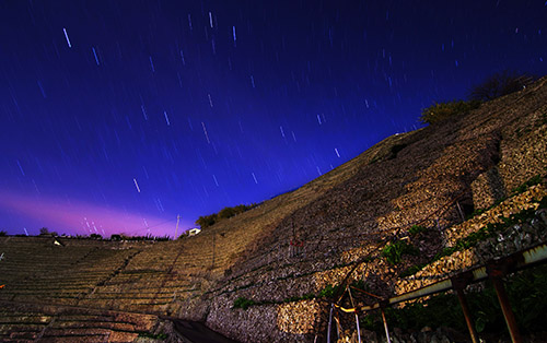 江戸時代終わり頃、サツマイモ栽培の段々畑に開墾されたのが始まりです。明治時代末から大正時代にかけて、養蚕経営のためサツマイモから桑栽培へと切り替わり、養蚕で得た収入で石垣が築かれました。現在はじゃがいもが栽培されており、NPO法人「段畑を守ろう会」が景観保持・環境保全に取り組んでいます。